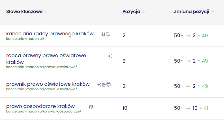 Kancelaria-madon.pl to podmiot świadczący kompleksową pomoc prawną w Krakowie. Strona internetowa na starcie nie odzwierciedlała potencjału firmy w wyszukiwarce Google. Poniższe opracowanie przedstawia drogę od zerowej widoczności do stabilnych wzrostów.