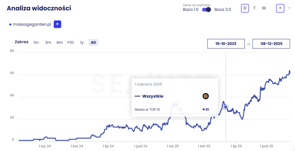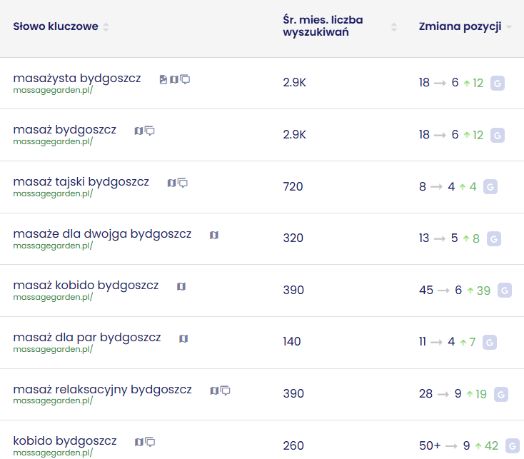 rozbudowa głównych kategorii: dla każdego rodzaju masażu stworzyliśmy osobną podstronę, co znacząco zwiększyło tematyczność witryny i umożliwiło lepsze pozycjonowanie na szczegółowe zapytania użytkowników.